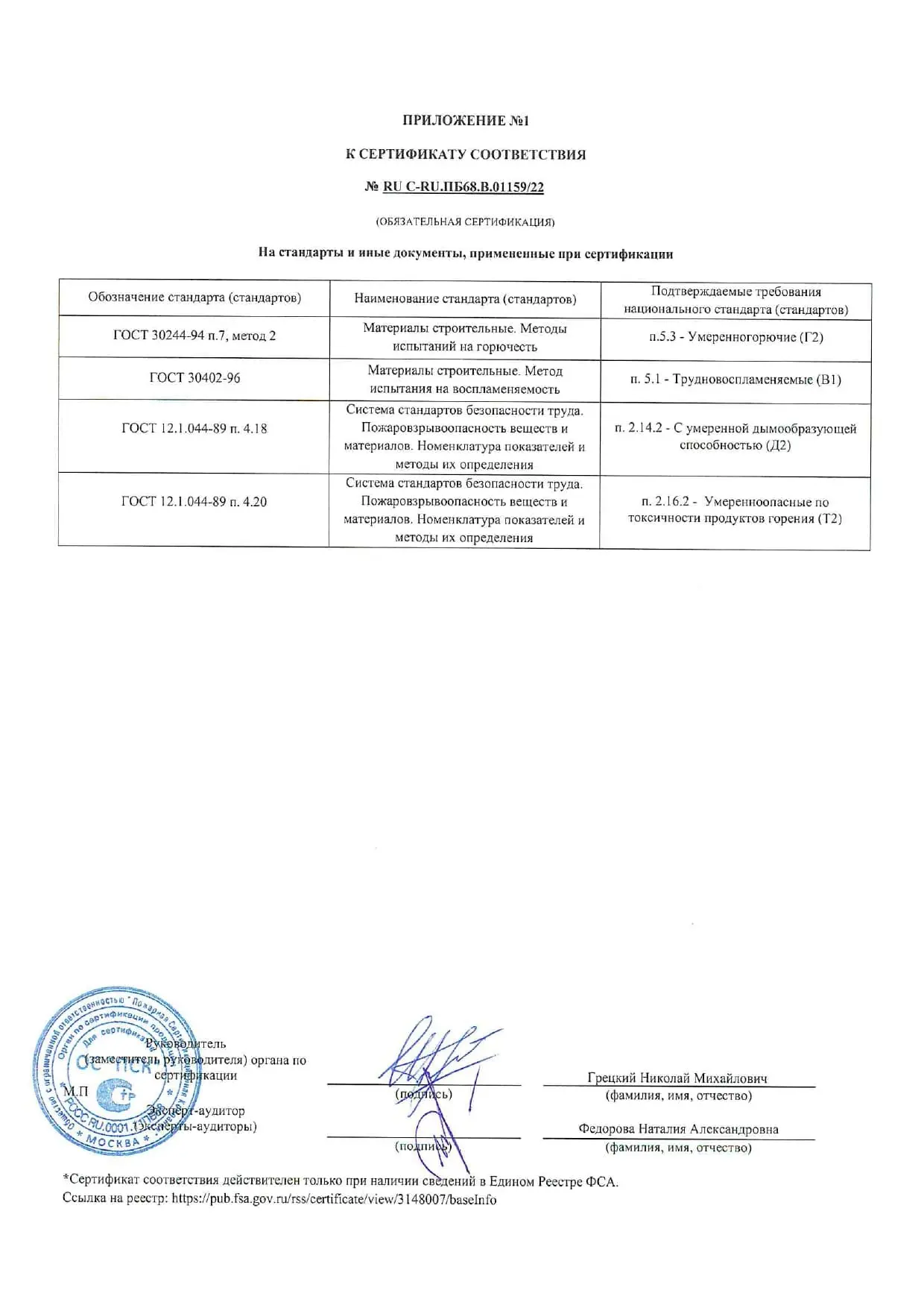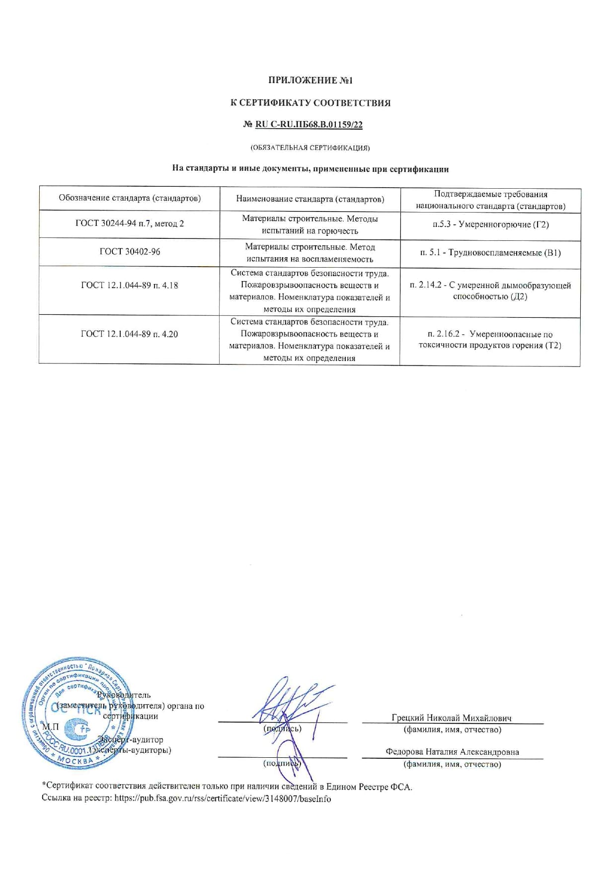 Пожарный сертификат на напылительные системы (класс горючести Г1)