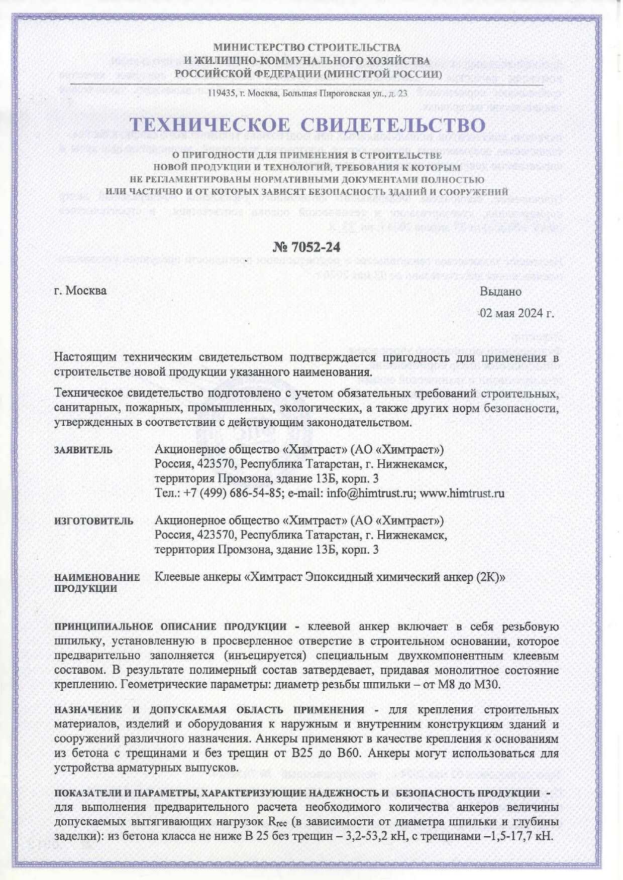 Техническое свидетельство Минстроя РФ на химические анкеры